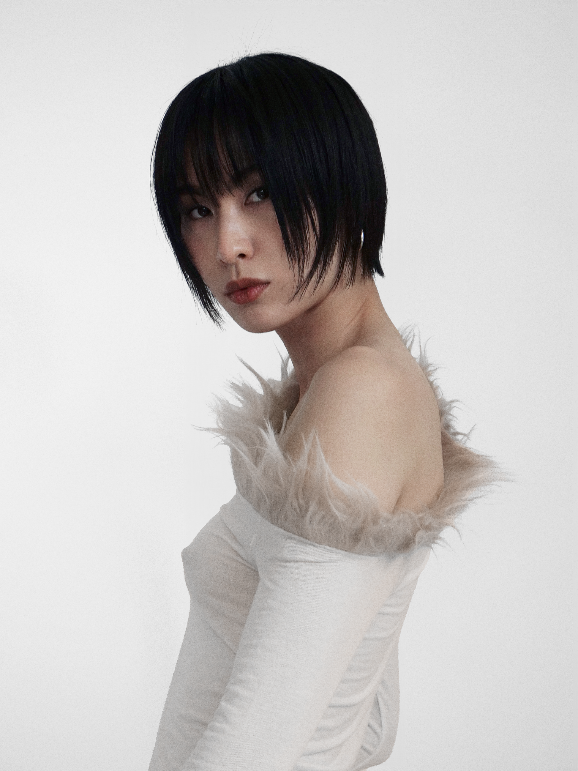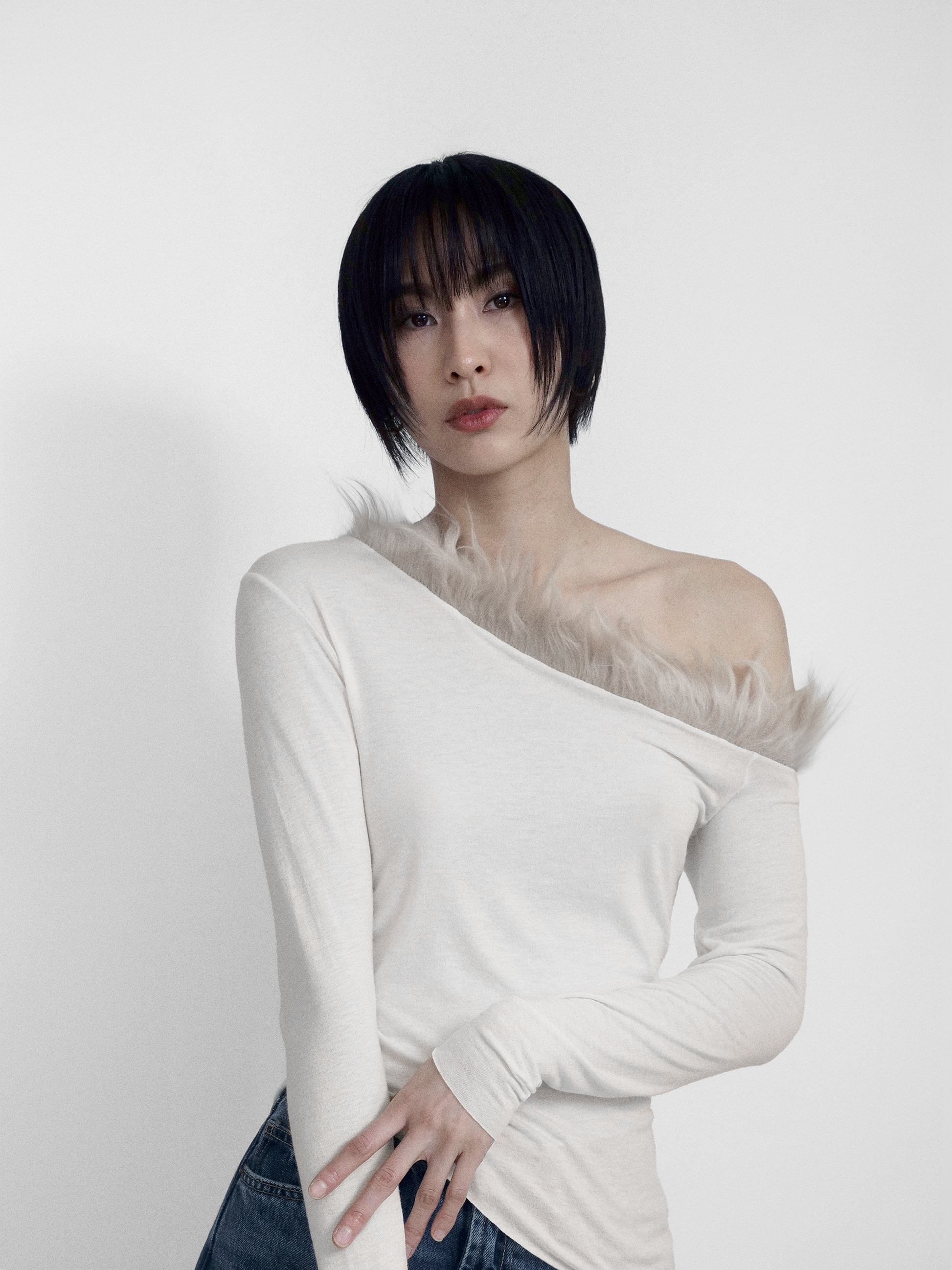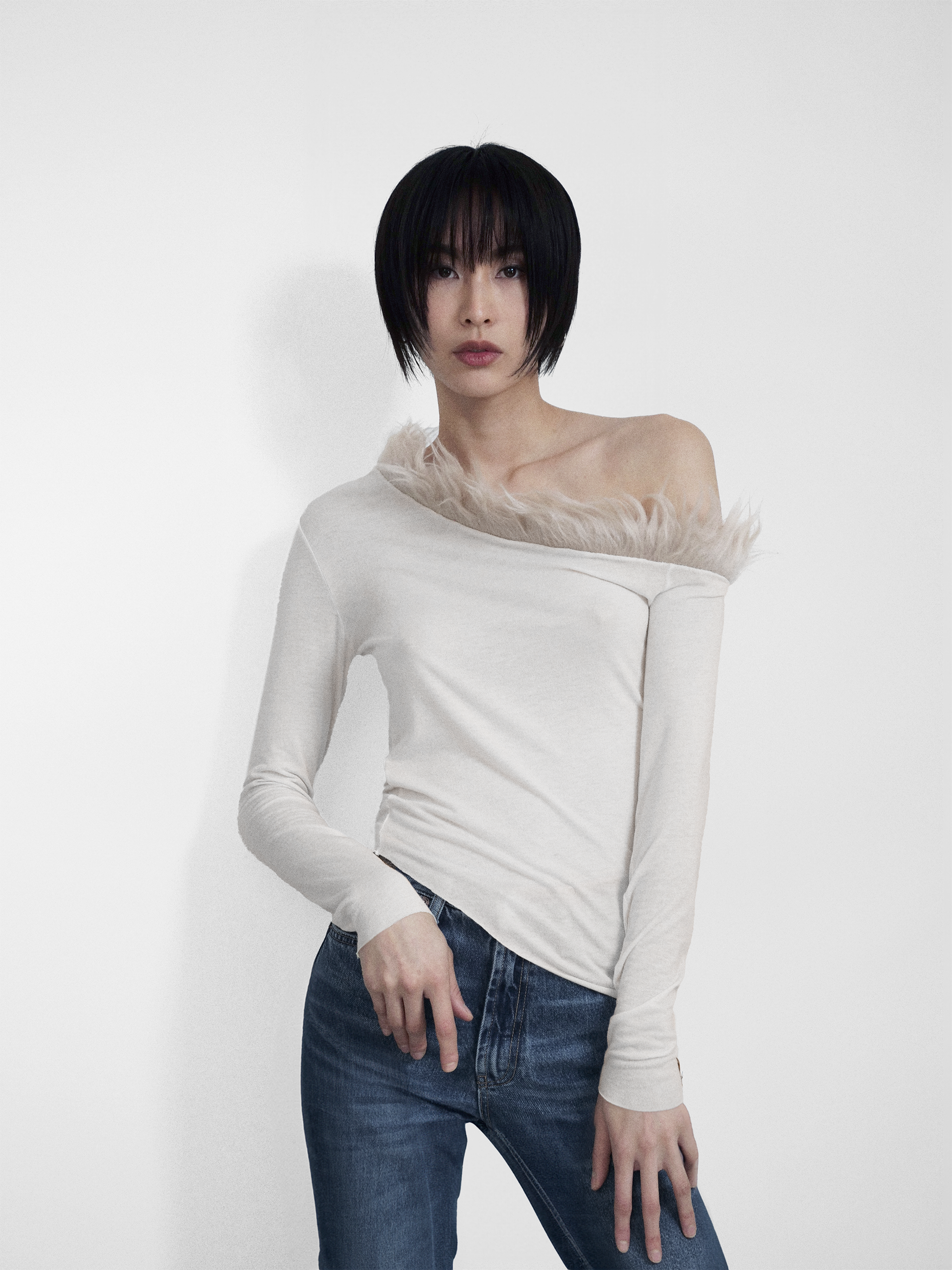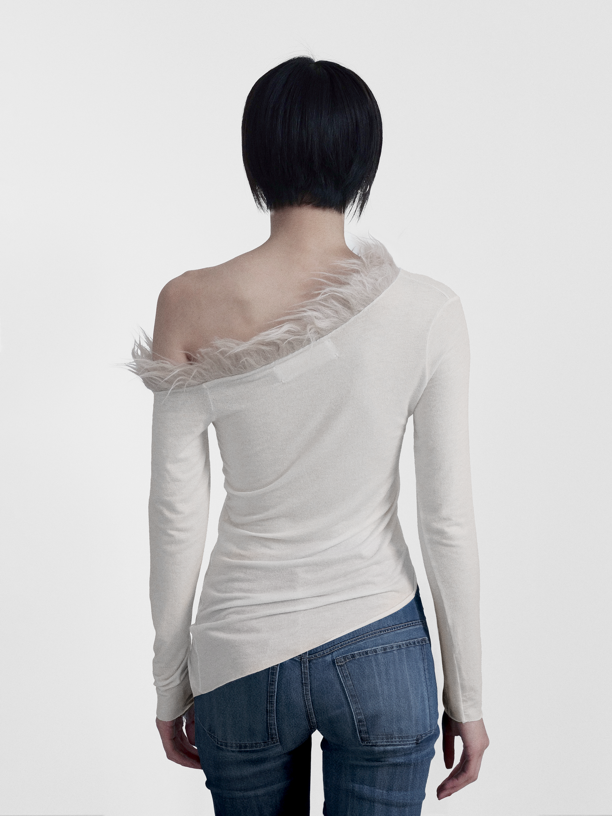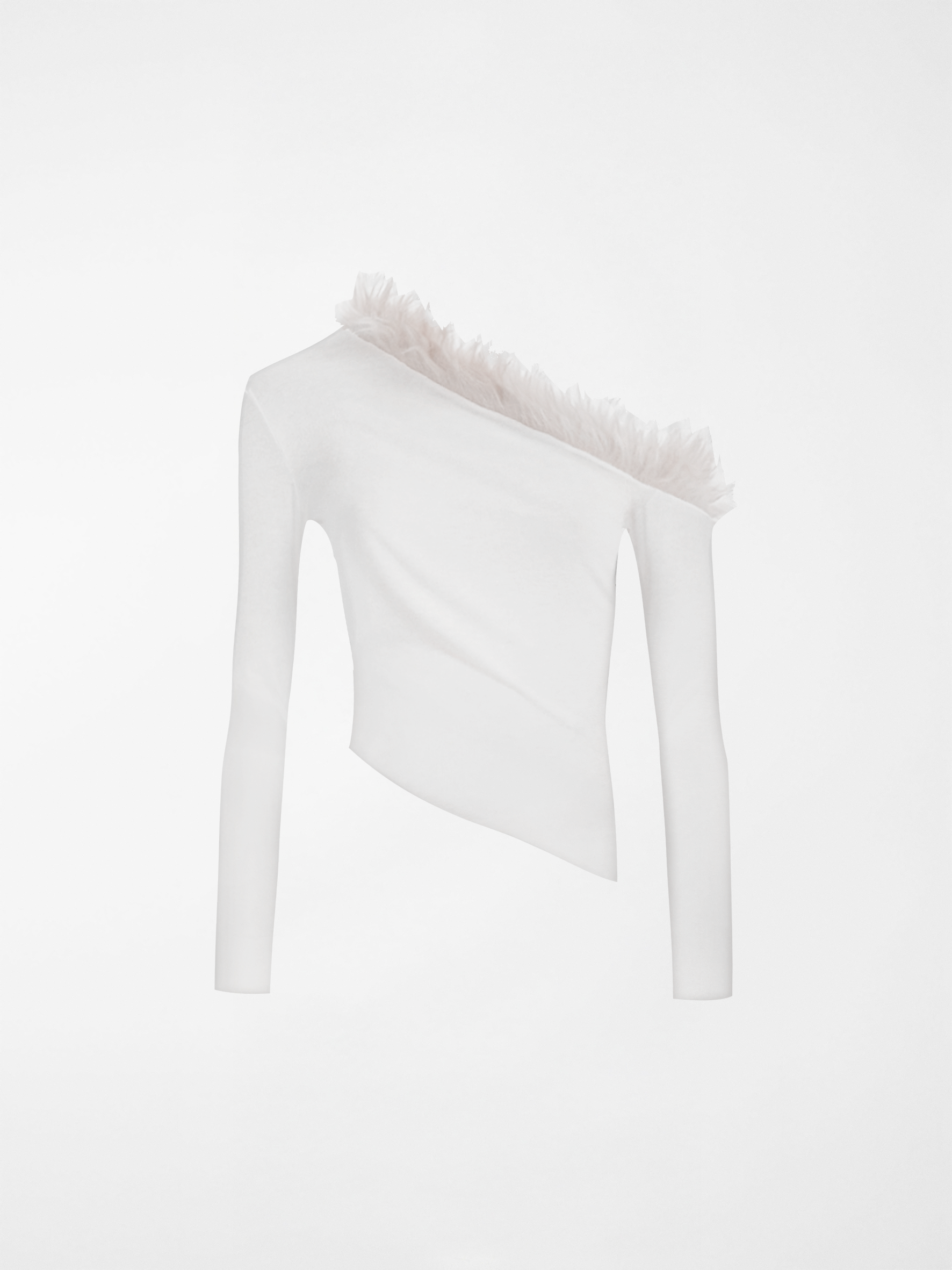 In Light Beige, made of recycled Cashmere blend Jersey, with a Faux Fur Off-one-Shoulder trim detail and an asymmetric hemline.
