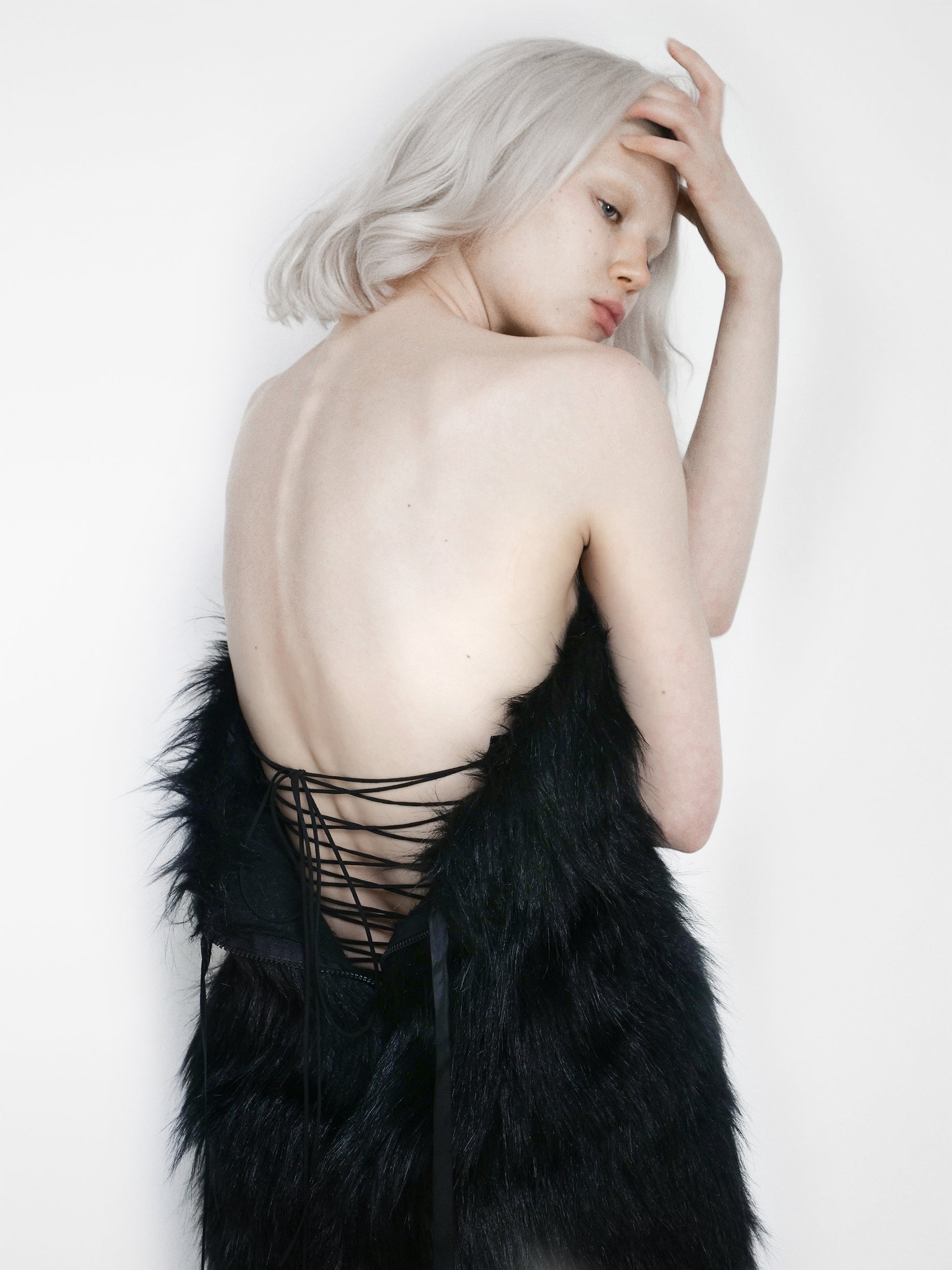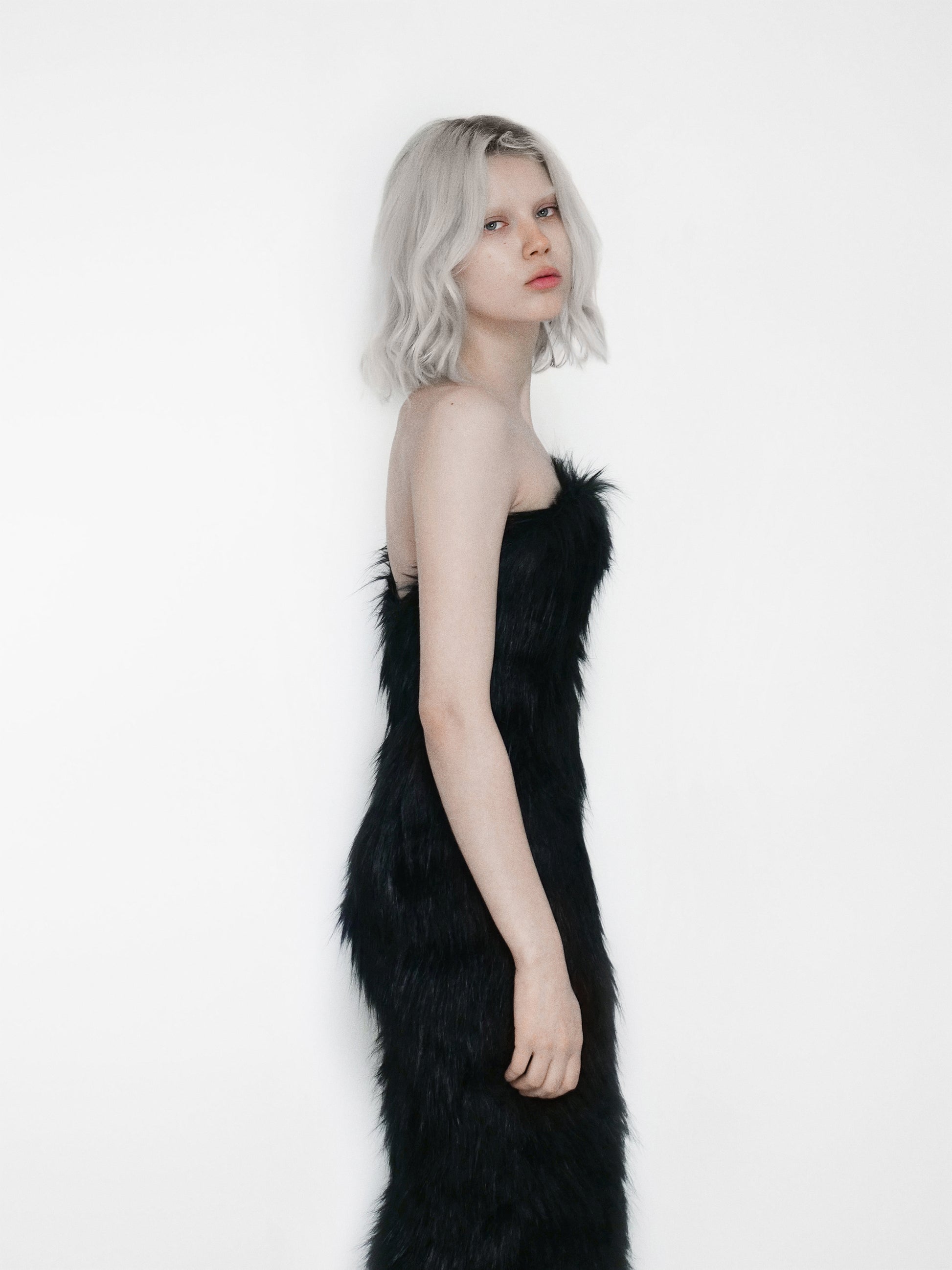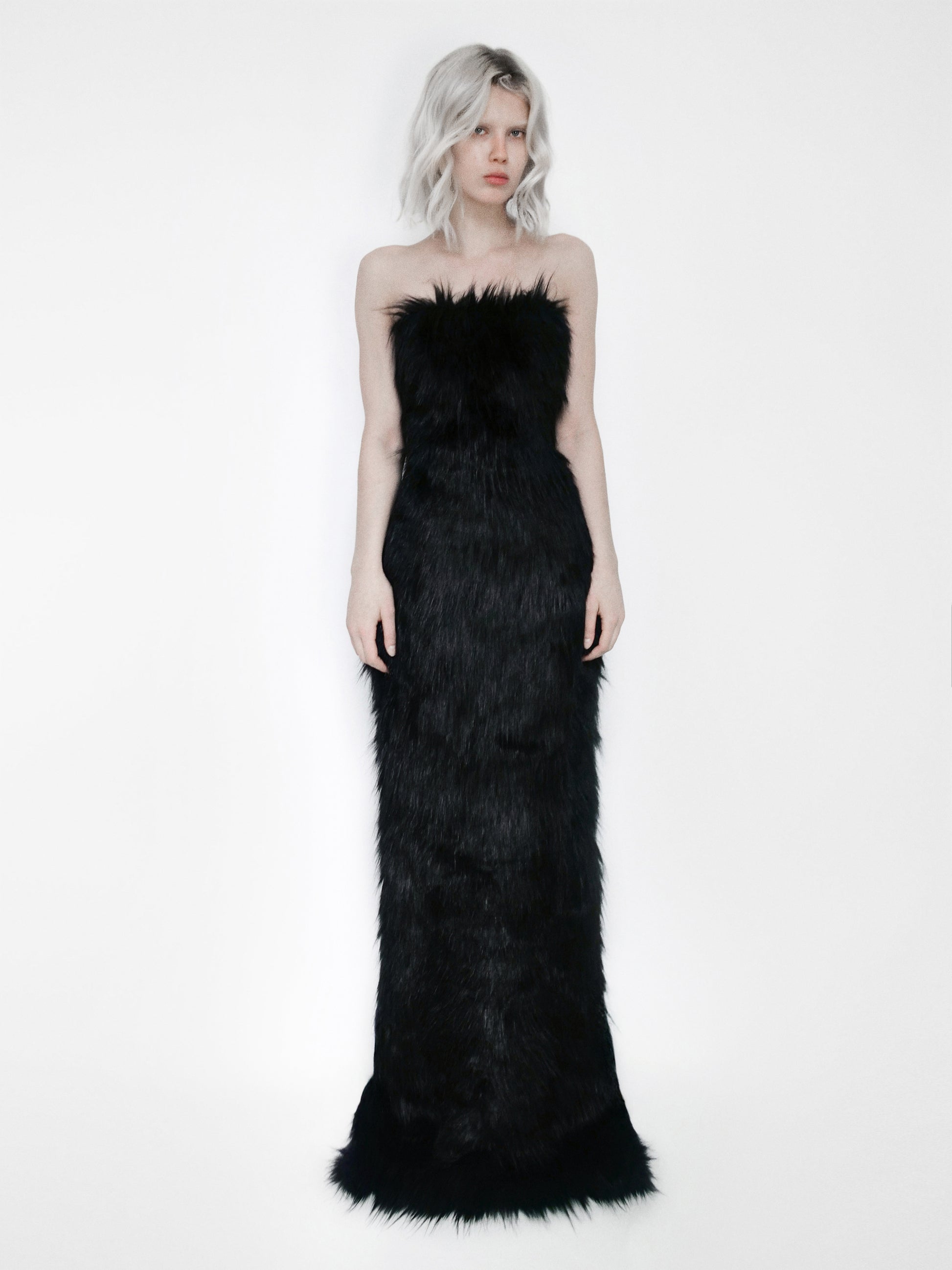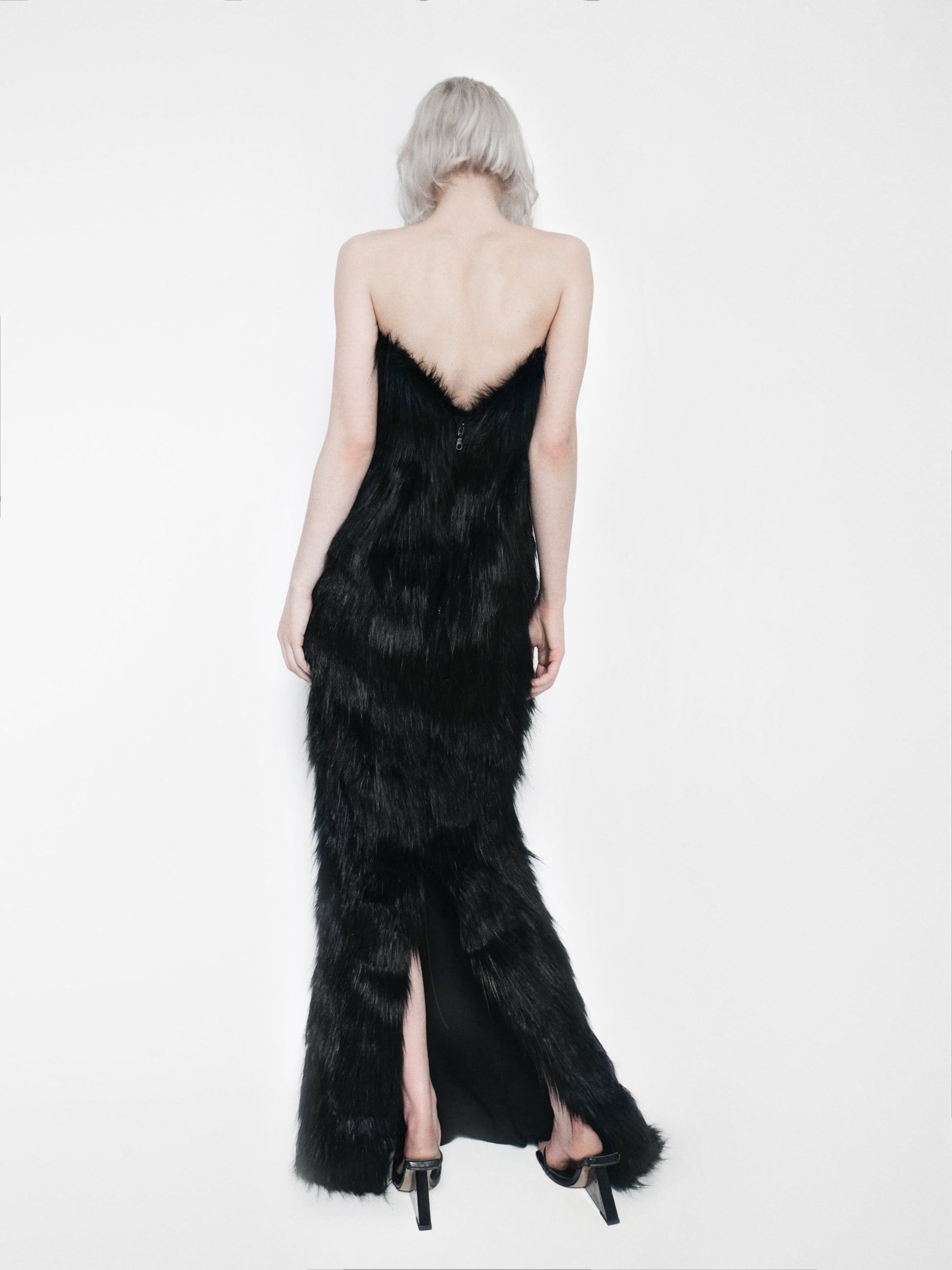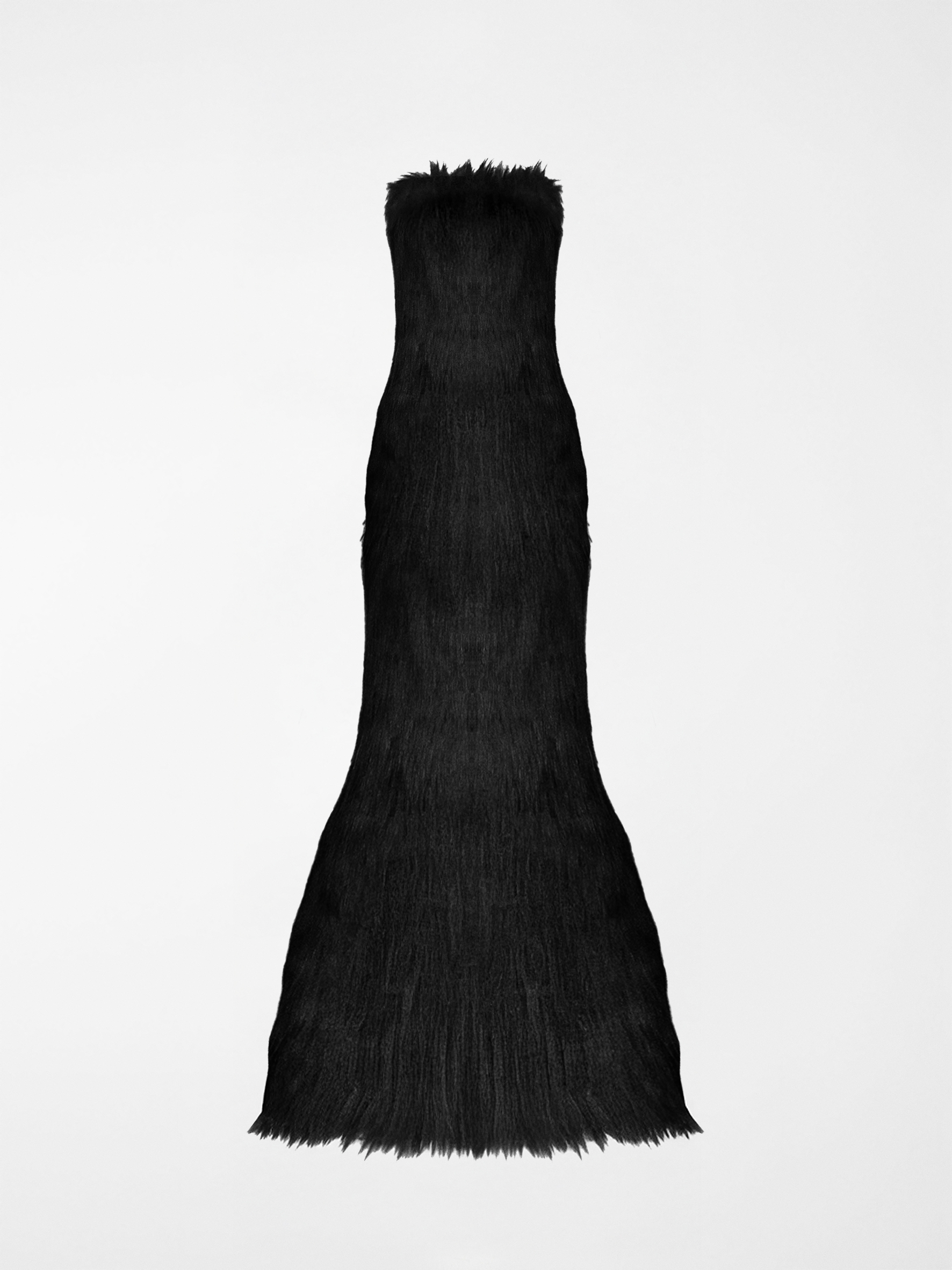 In Black, fully made of Deadstock Faux Mink Fur. This form-fitting Gown features a full-length zipper and internal corset fastening for an extra secure fit.