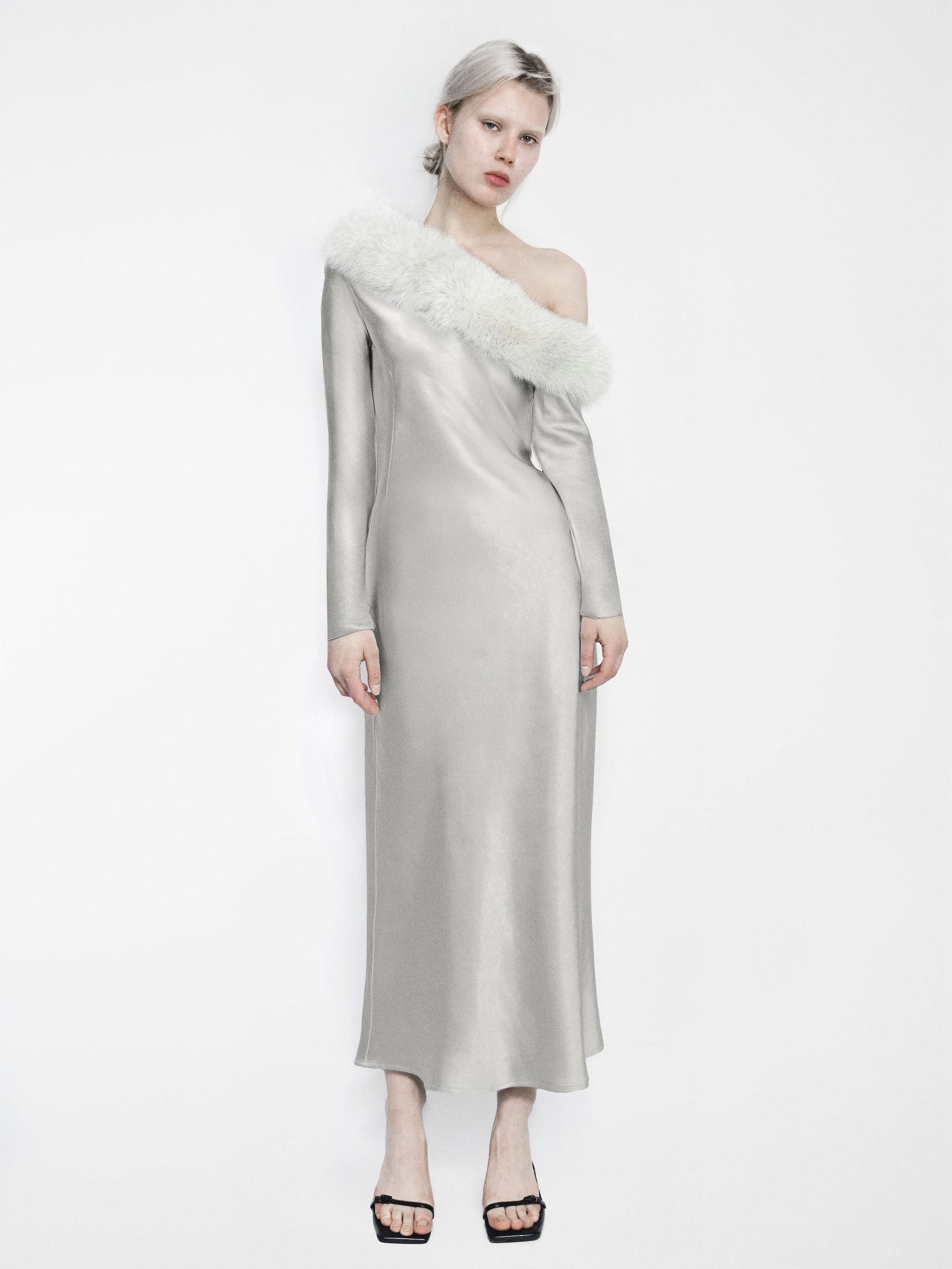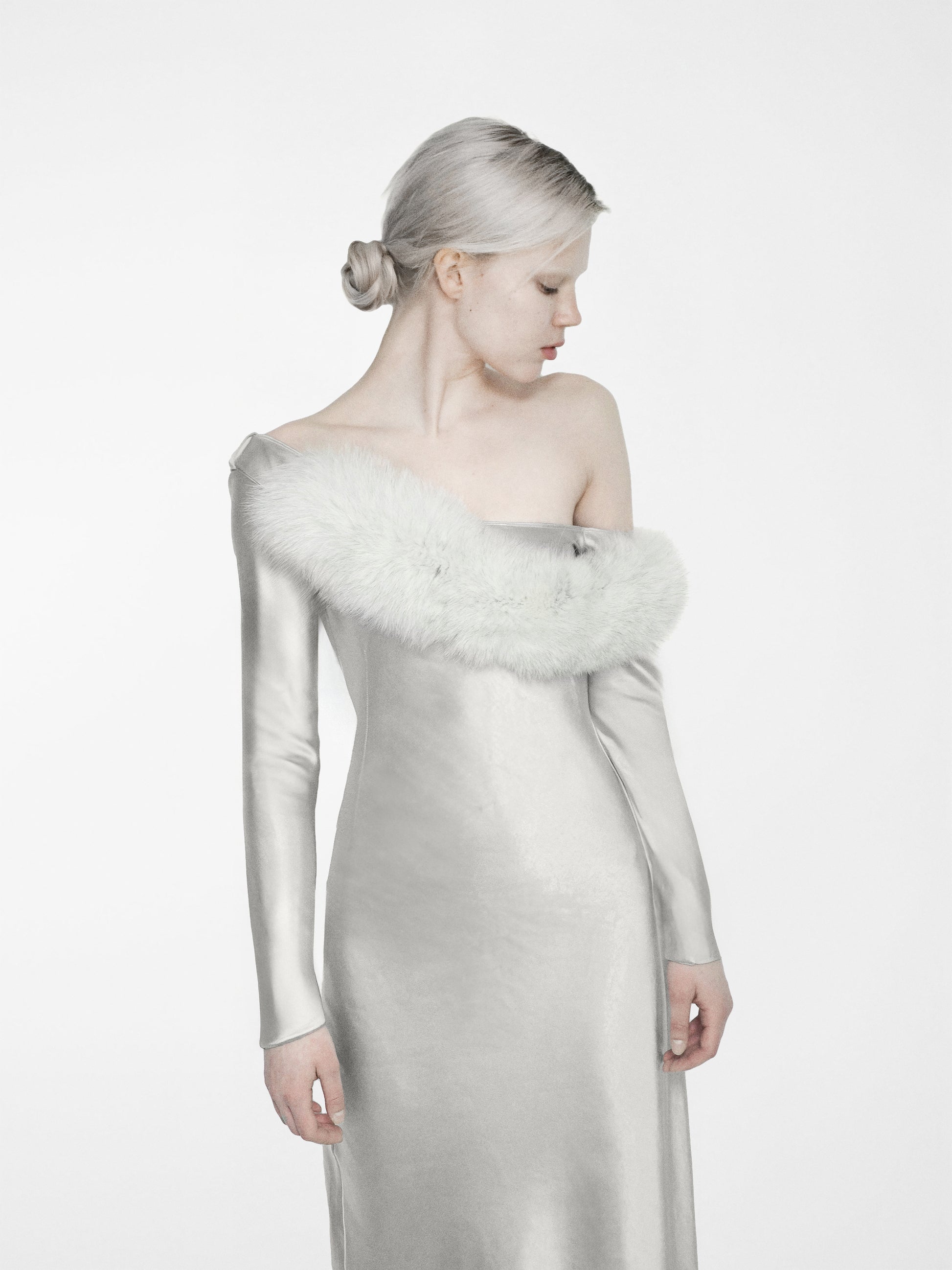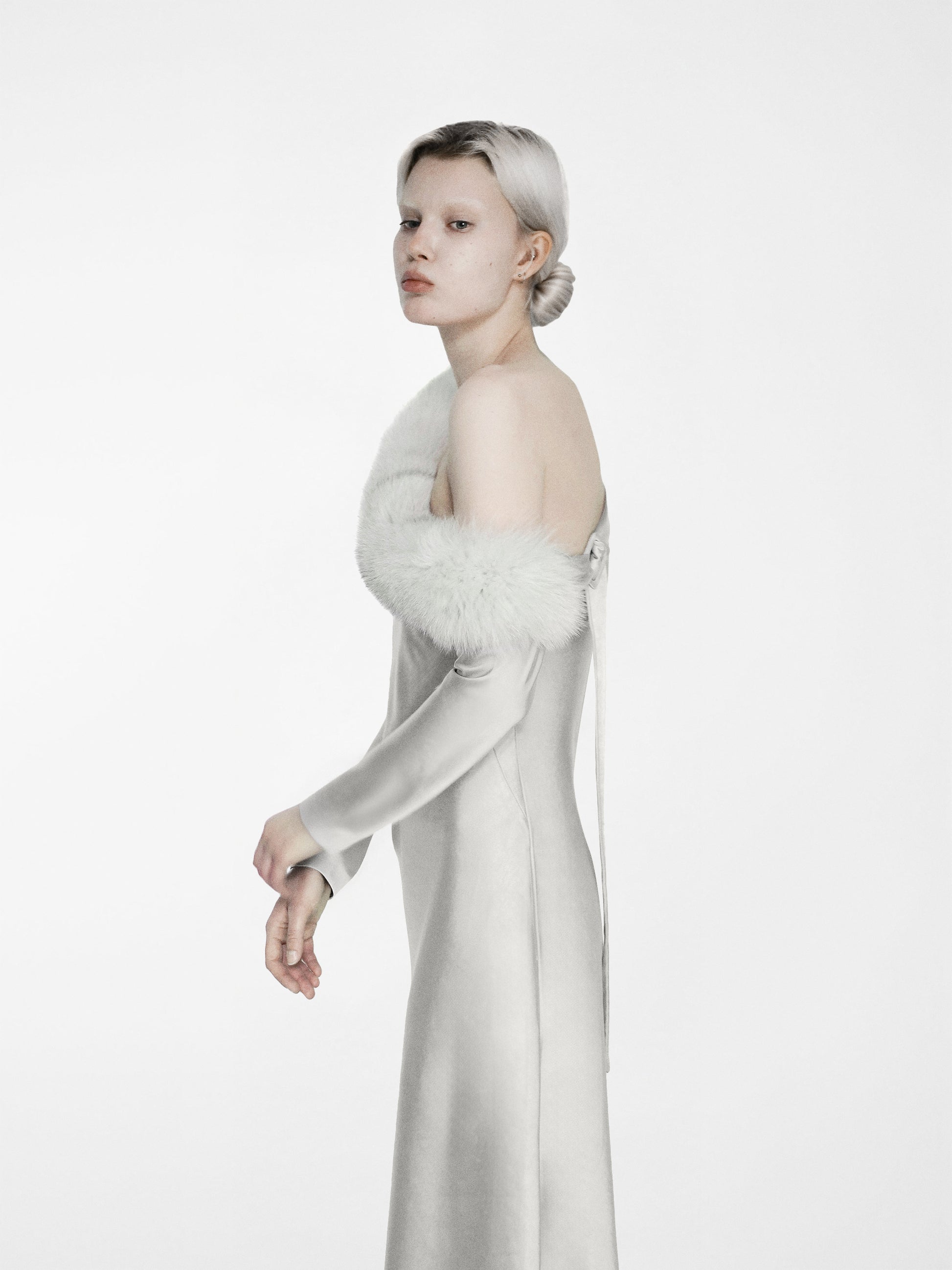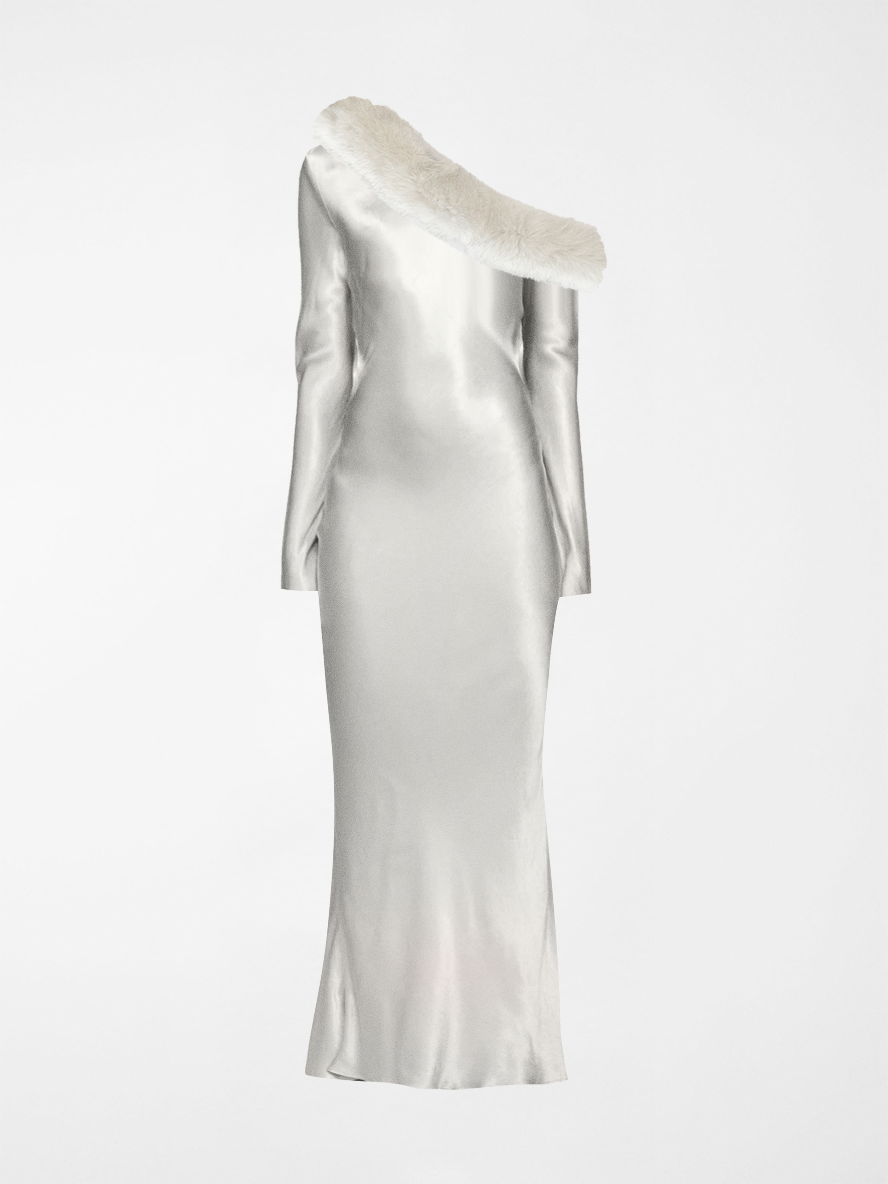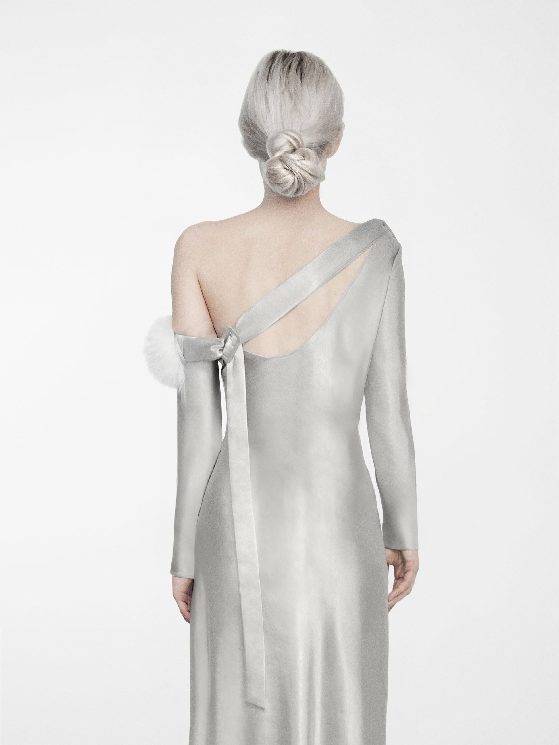 In Silver, made of 100% Silk Satin, with a detachable Real Vintage Fox Fur Off-the-Shoulder detail. Featuring an elegant drop-shoulder and open back.