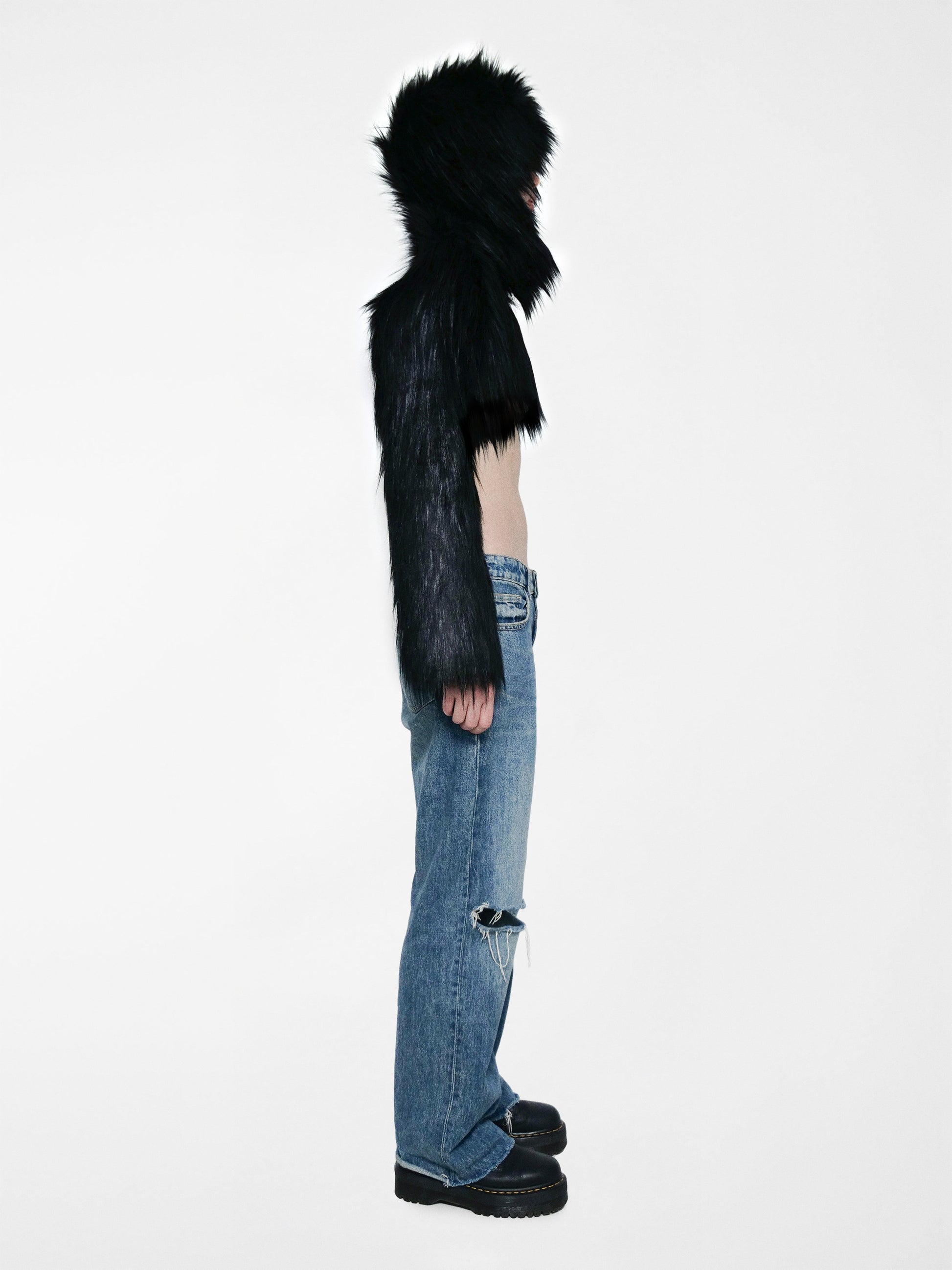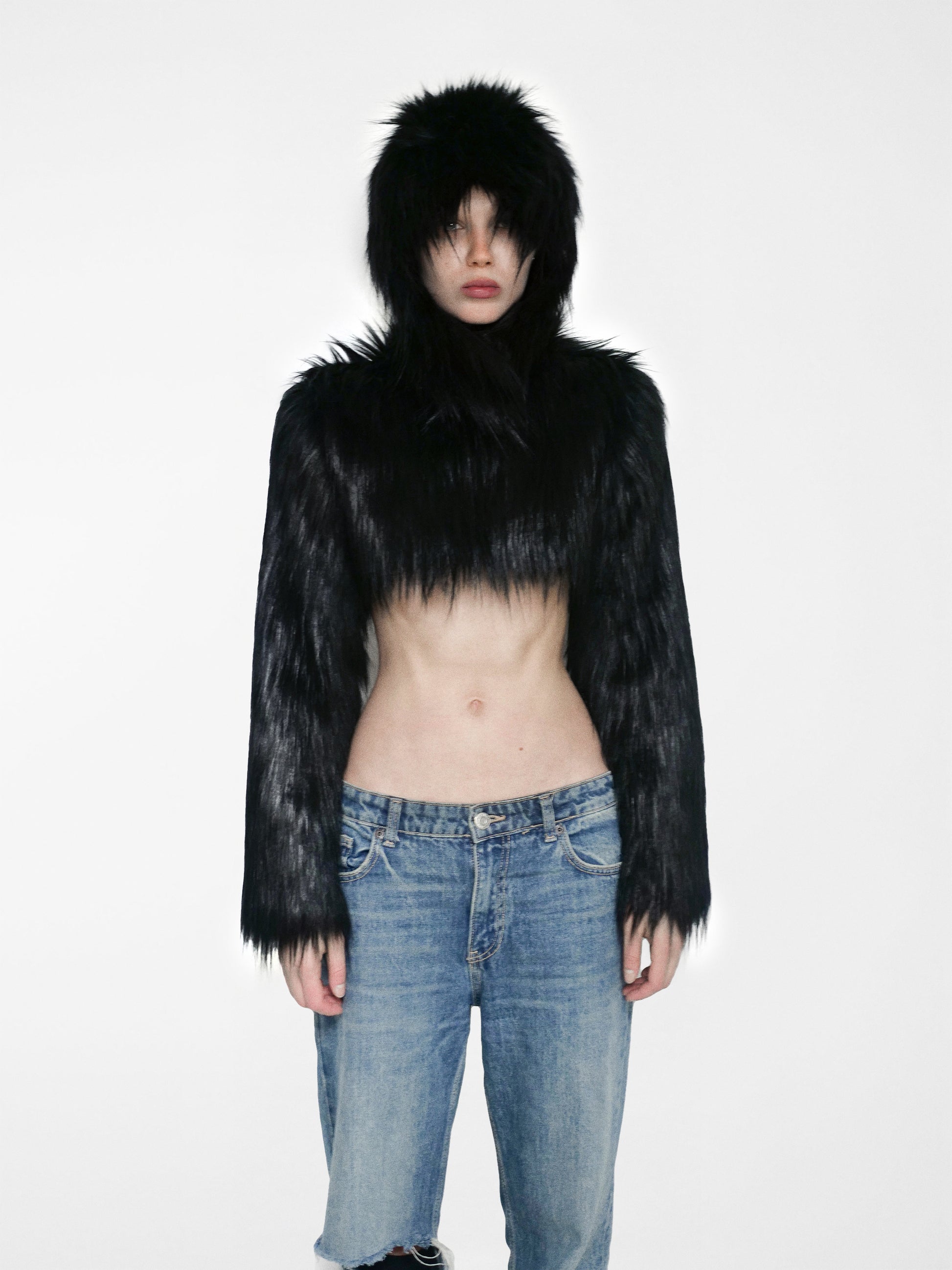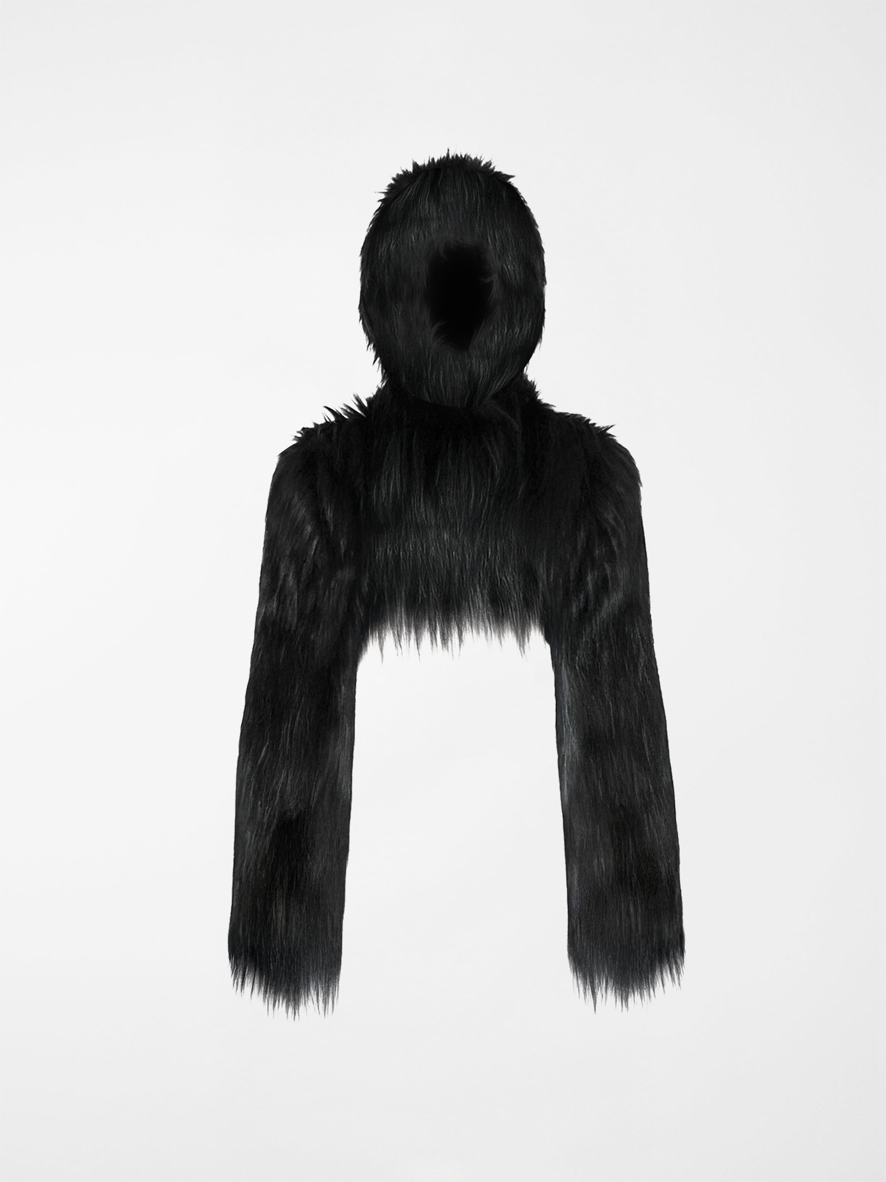 In Black, fully made of Deadstock Faux Mink Fur. Invisible zip on the back. Detachable Hood, held by push buttons.