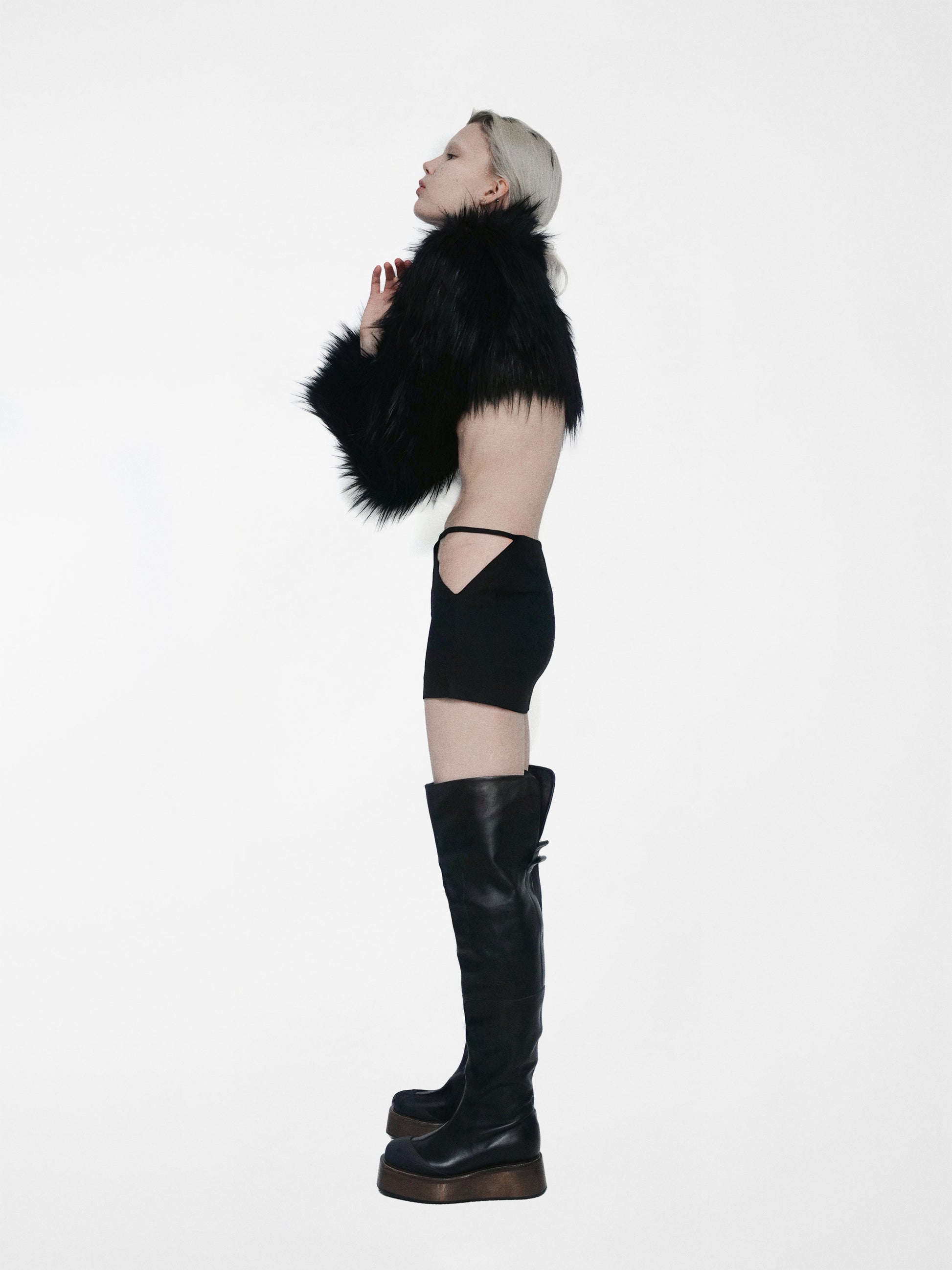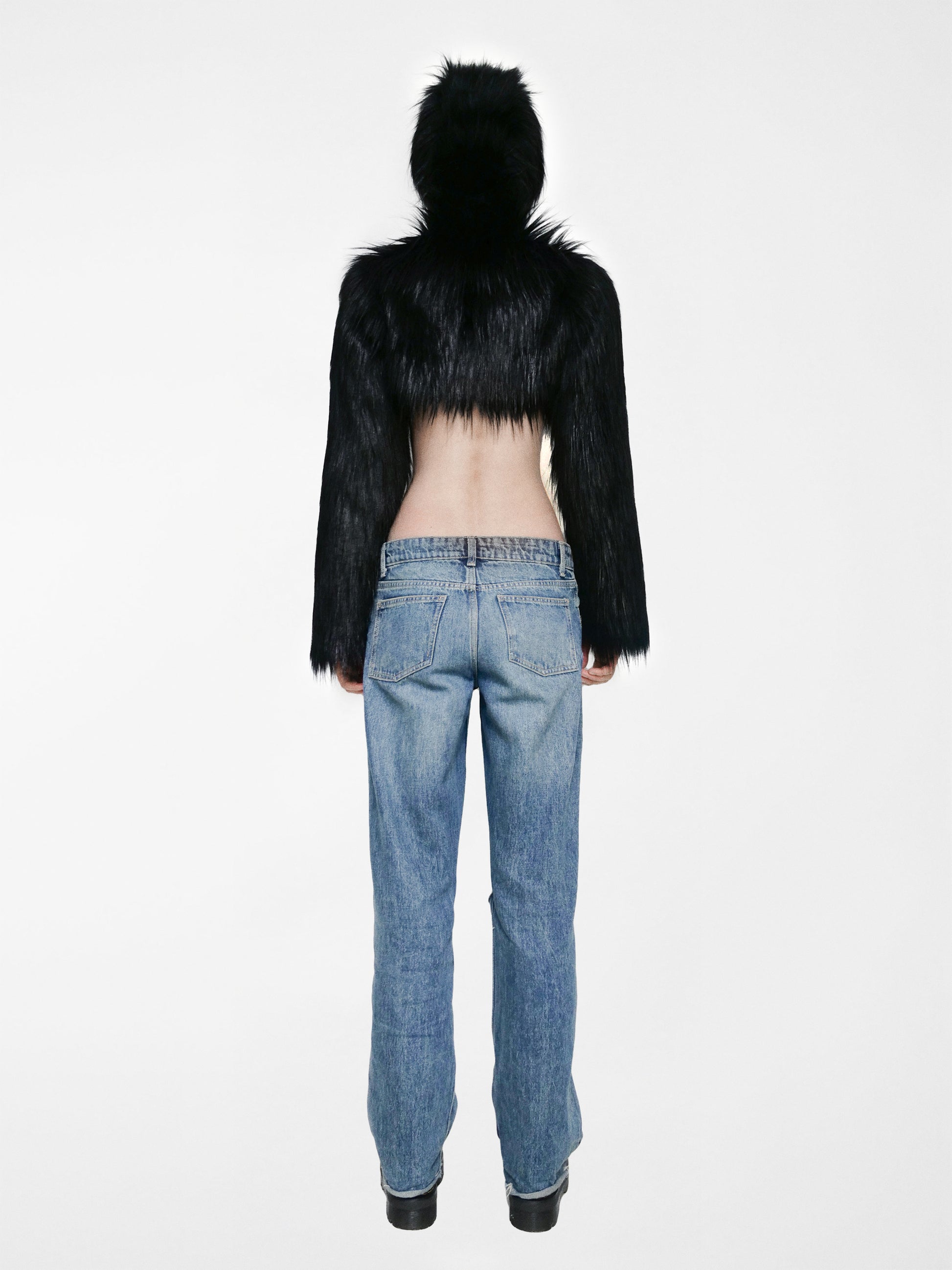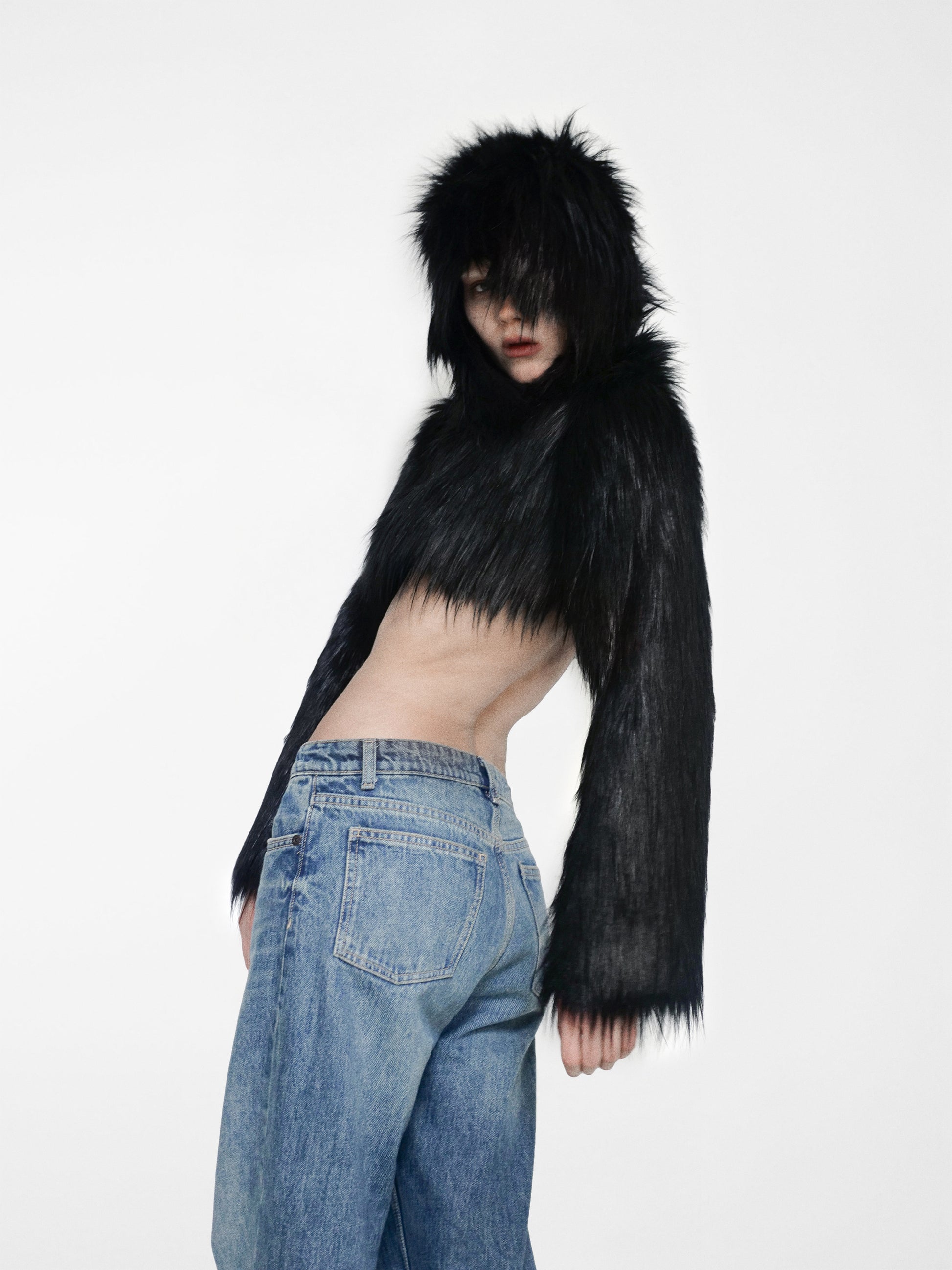 In Black, fully made of Deadstock Faux Mink Fur. Invisible zip on the back. Detachable Hood, held by push buttons.