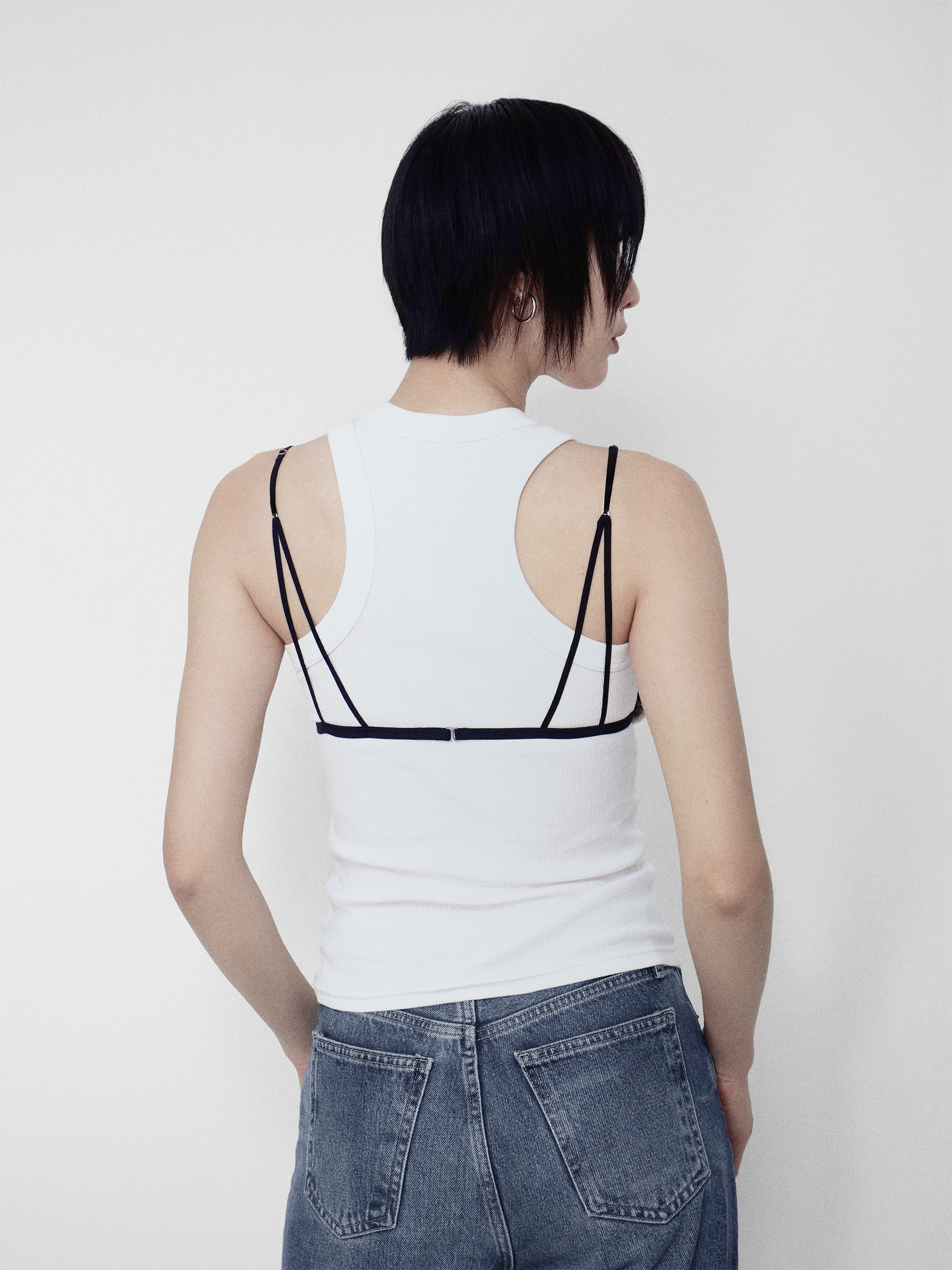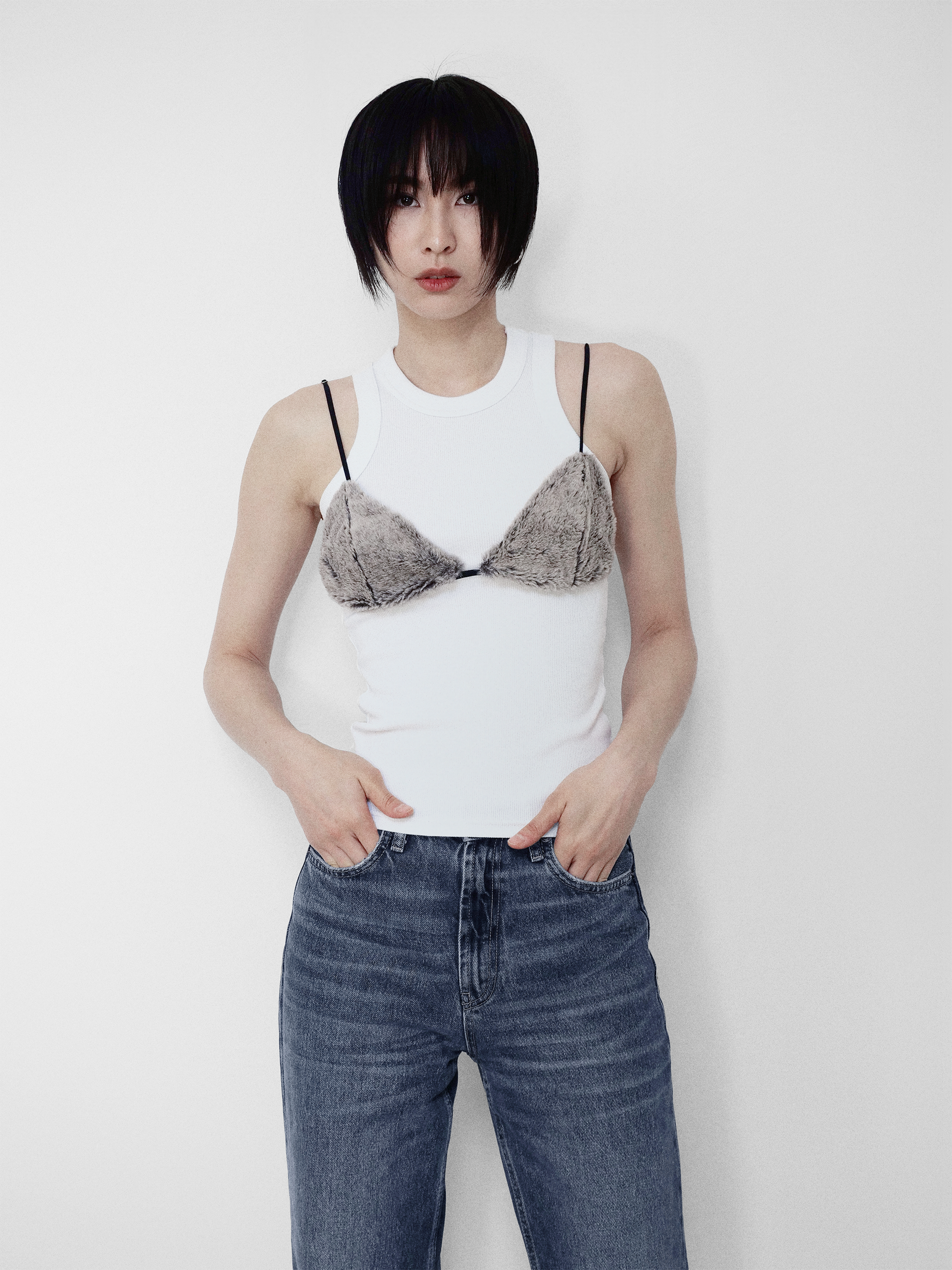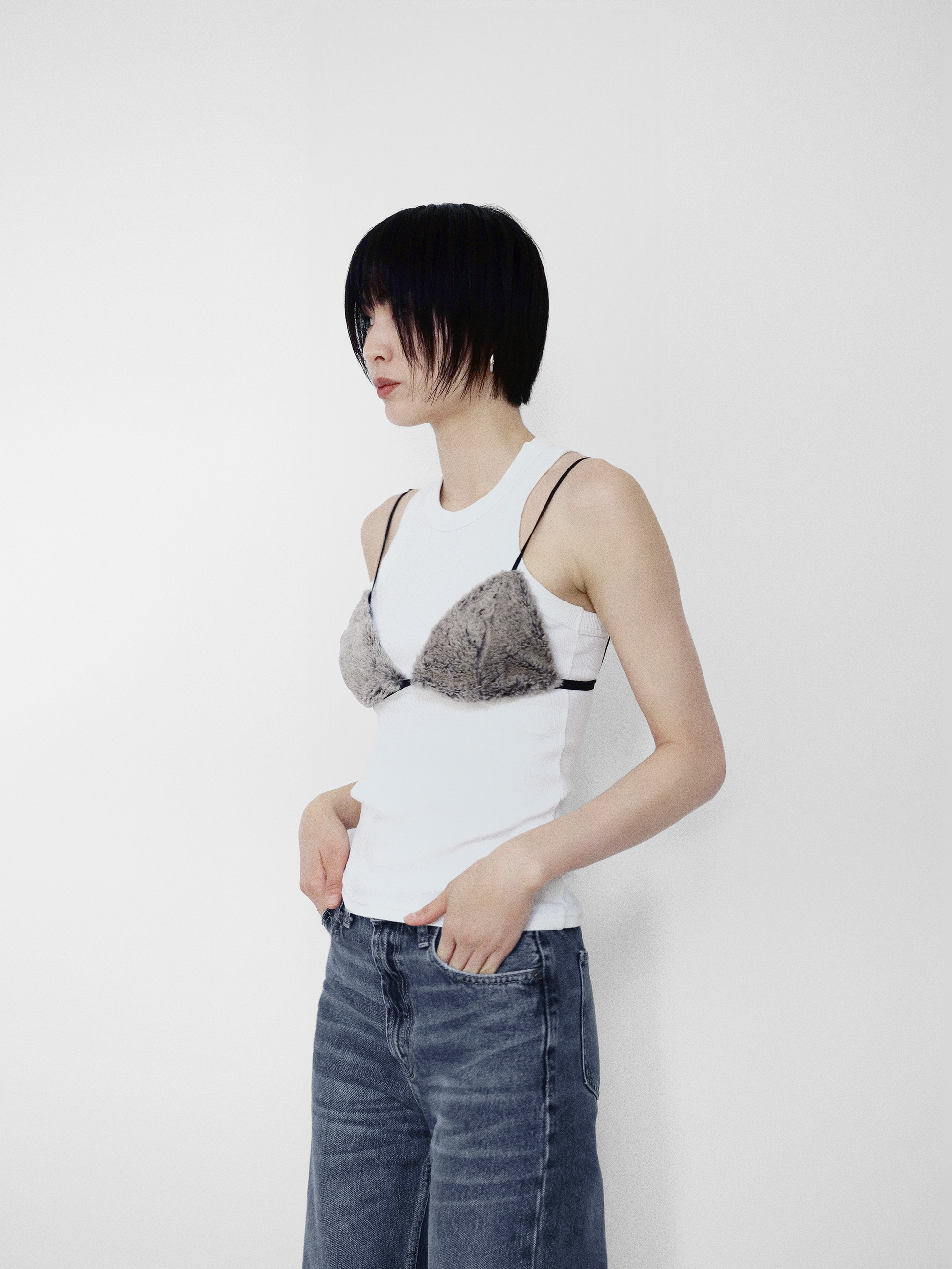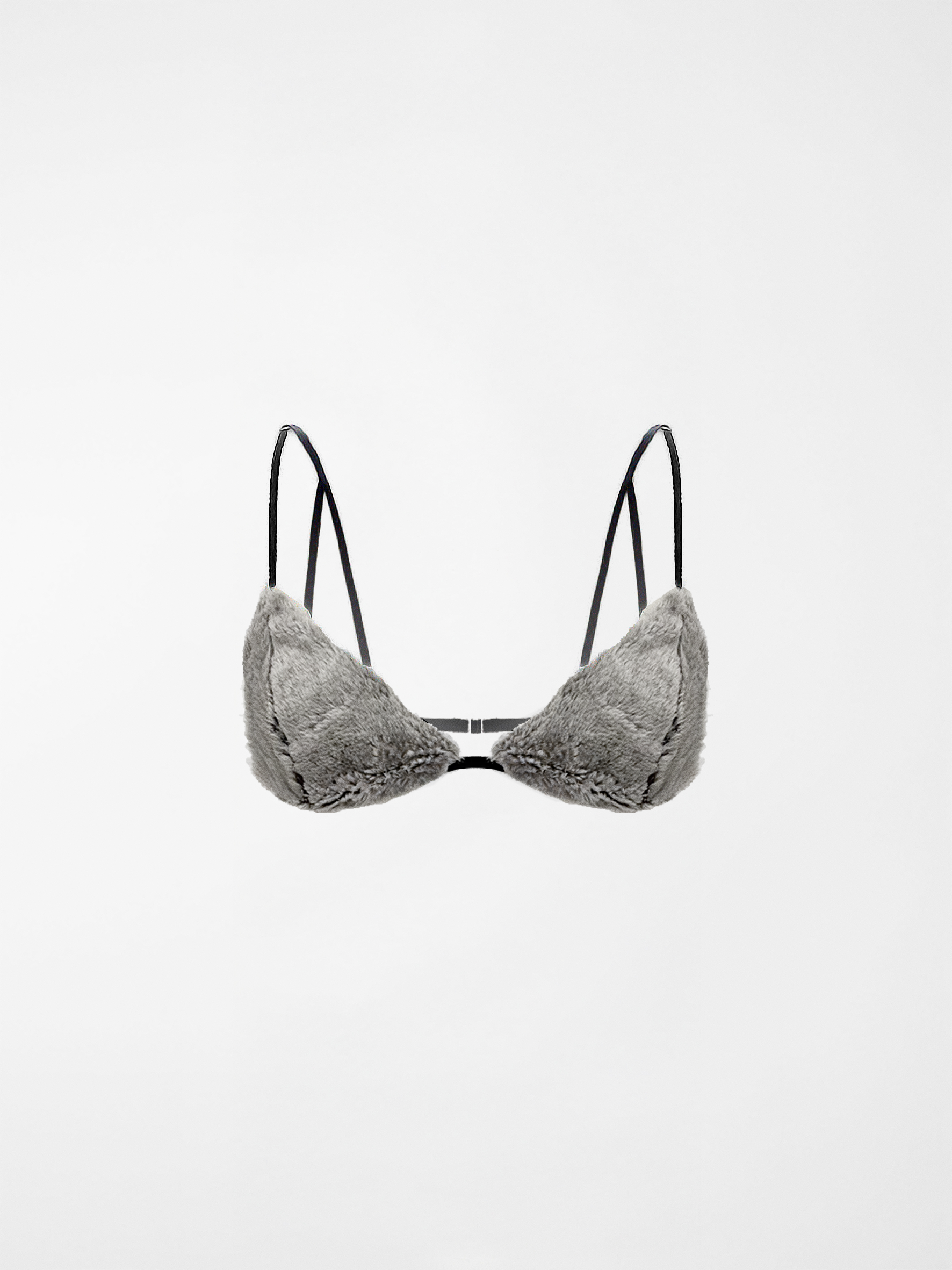 In Grey Faux Wolf Fur, Black Mesh Recycled polyester.